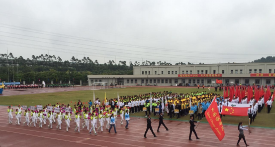 党委周海兵书记和鄢智青副书记的带领下,手举小国旗和啦啦球,踏着坚定的步伐向主席台走来。他们个个精神抖擞,整齐有力的步伐、气势磅礴的口号、笔直挺拔的身影和充满朝气的脸庞向领导和观众们展现了外院学子青春阳光、奋发向上和勇往直前的精神面貌。